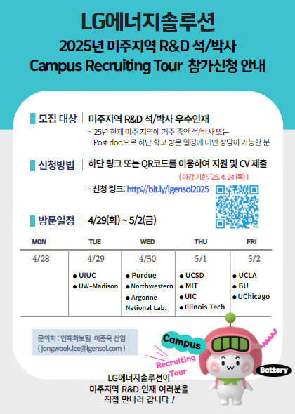 [LG에너지솔루션] 2025 미주지역 R&D 석/박사 Campus Recruiting(5/1) 안내 (사전등록~4월 24일)