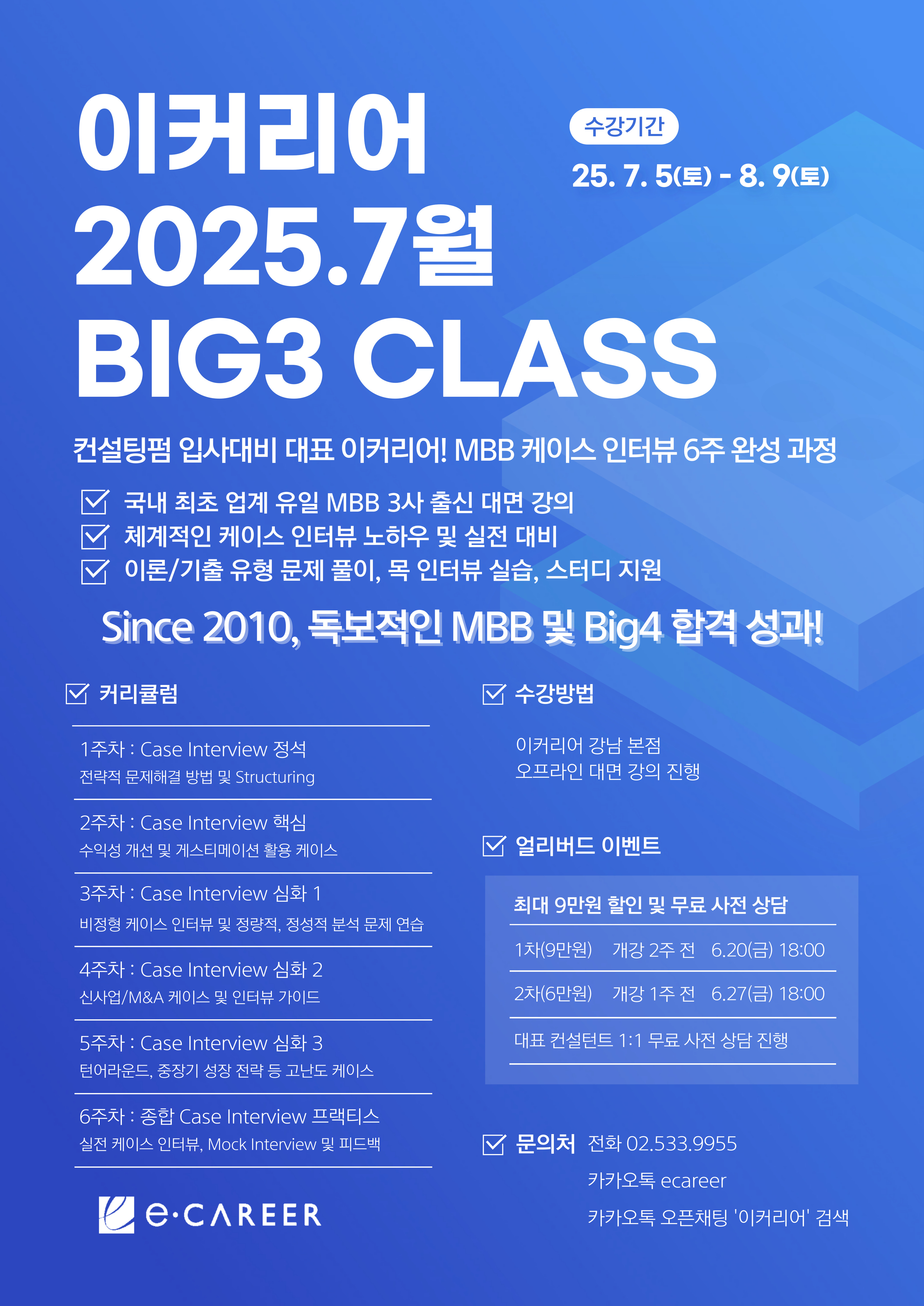 국내 유일! MBB(McKinsey, BCG, Bain) 3사 출신 컨설턴트가 직접 강의하는 ‘이커리어 BIG3(MBB) 컨설팅펌 케이스 인터뷰 대비 정규 과정’ 여름 Class가 2025년 7월 5일(토) 개강합니다!