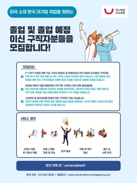 유니버설 리크루팅은 미국 내 100개 이상의 한국 대기업 및 그 협력업체들에서 인사 채용 외주를 맡아 운영하고 있는 리크루팅 에이전시입니다.